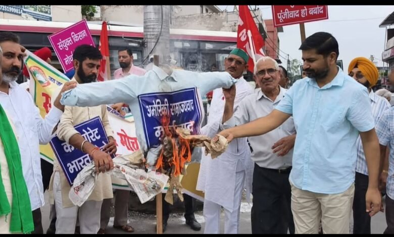 संयुक्त किसान मोर्चा ने फूंका अमेरिकी राष्ट्रपति डोनाल्ड ट्रम्प का पुतला।
